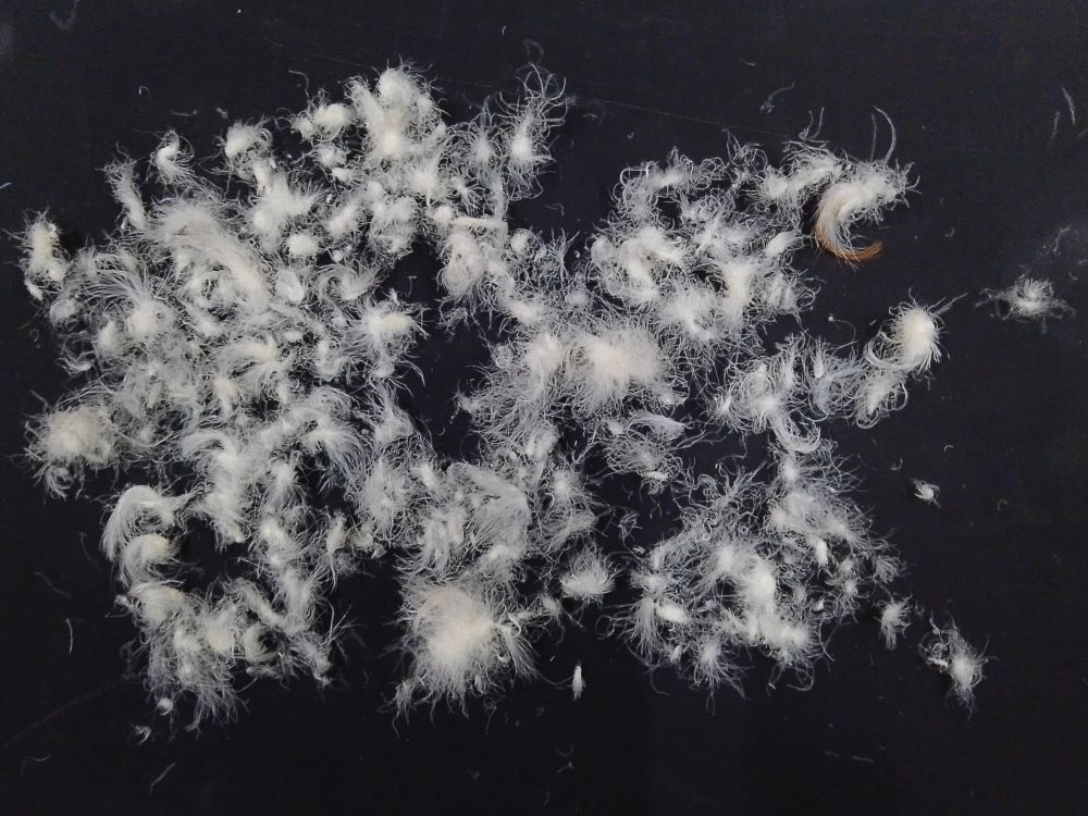 羽毛を洗浄し、除塵や選別によって不要なゴミを取り除くと、元の重量より減ってしまいます。非常に良いもので10%、通常は15~20%ほどが減ります。