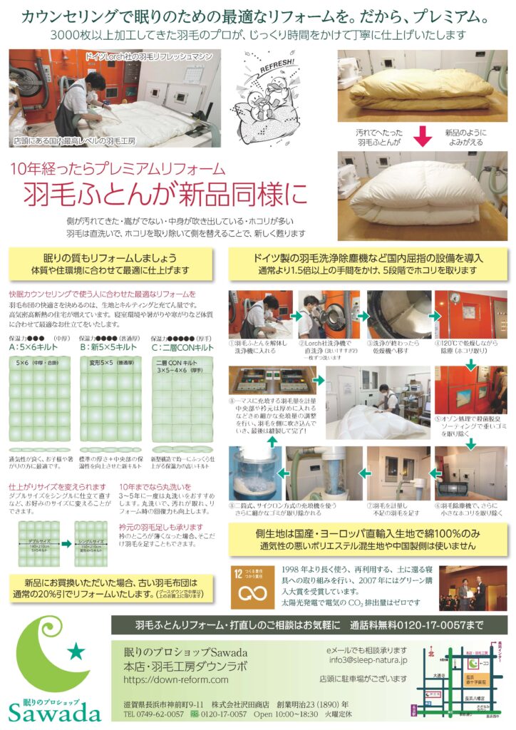 眠りのプロショップSawadaは滋賀県長浜市にある寝具専門店。創業1890年、135年の歴史を持つ老舗です。30年以上前から、羽毛布団のリフォームを自社で行う設備を整えてきました。